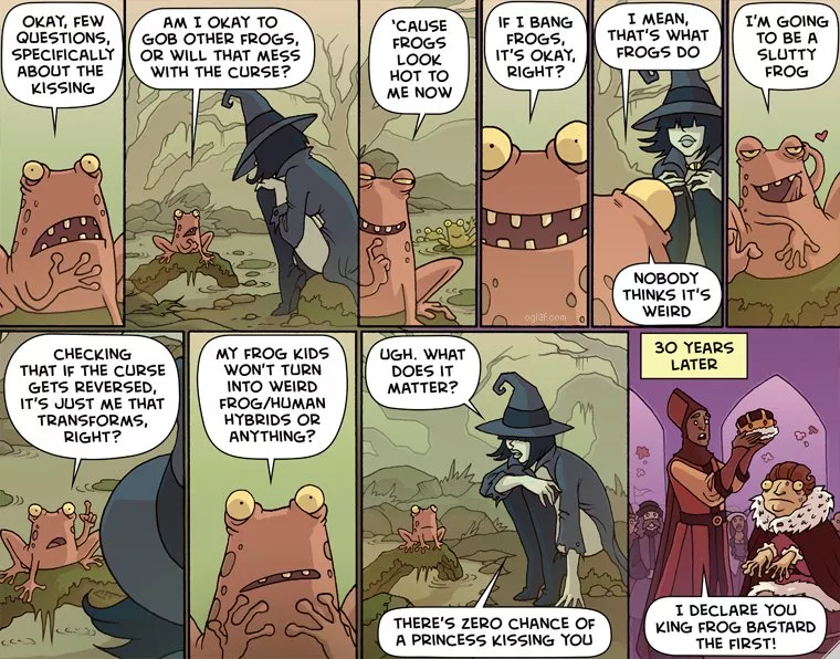"I'm going to be a slutty frog" Feral (ish) implied M>M & their offspring (humor) (Oglaf.com)